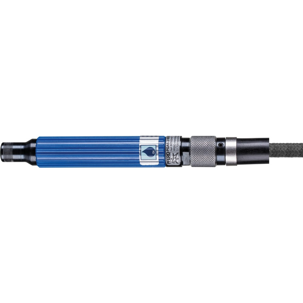 Prestanda: Elastiskt lagrad spindel. Vibrationsfri användning. PGAS 2/800 E-HV Dödmansgrepp-avstängning genom ventilutförande med hävarm. Ingår: 0,32 m från- och 2 m tilluftsslang utan nipplar, spännhylsa 3 mm, 2 st spännycklar.